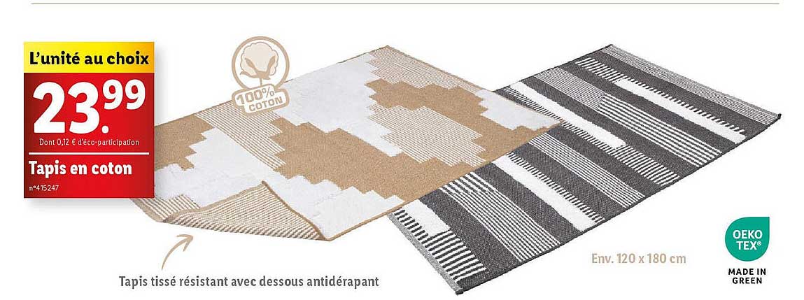 Découvrez l'offre de Tapis En Coton chez Lidl! Cette offre fantastique est maintenant disponible dans le nouveau catalogue de Lidl. Profitez de cette occasion et économisez considérablement sur votre achat.