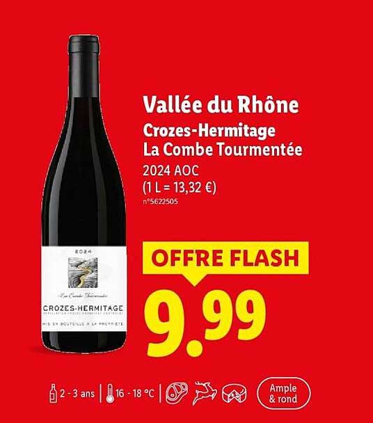 Découvrez dès maintenant la offre Vallée du Rhône Crozes-Hermitage La Combe Tournée dans le catalogue de Lidl. Cette offre est valable du 04/09/2025 au 10/09/2025.