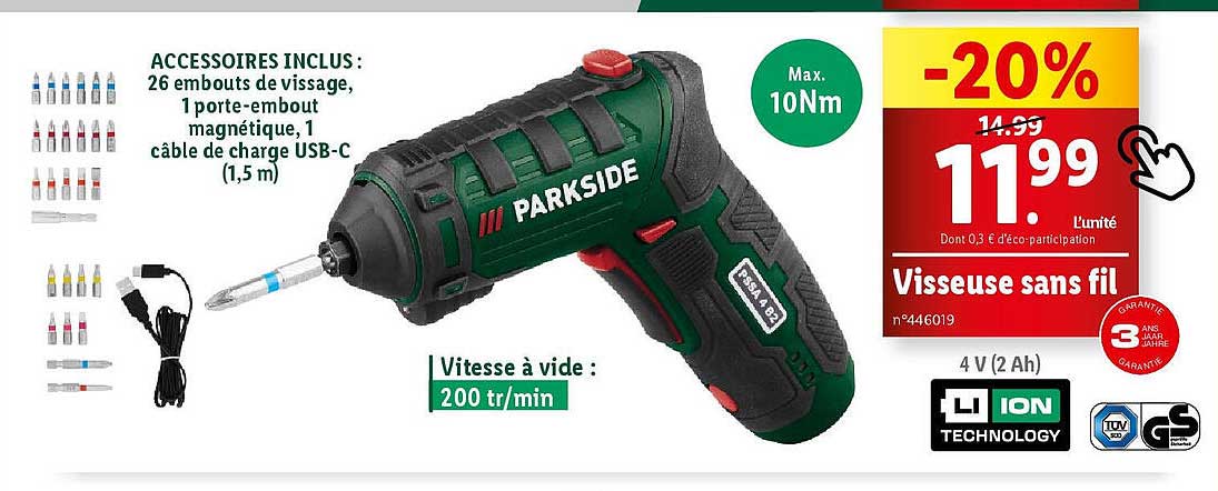 Découvrez dès maintenant la offre Visseuse sans fil dans le catalogue de Lidl. Cette offre est valable du 10/09/2024 au 14/09/2024.