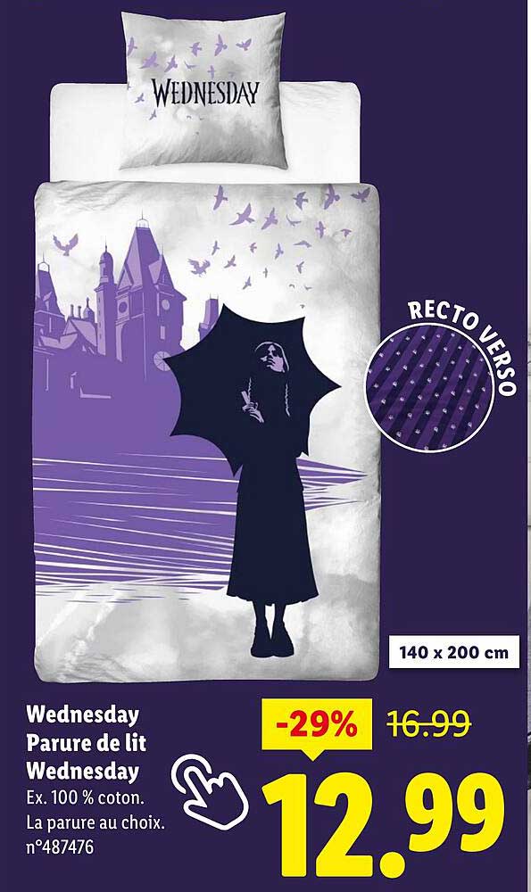 Découvrez dès maintenant la offre Wednesday Parure de lit Wednesday dans le catalogue de Lidl. Cette offre est valable du 13/10/2025 au 16/10/2025.