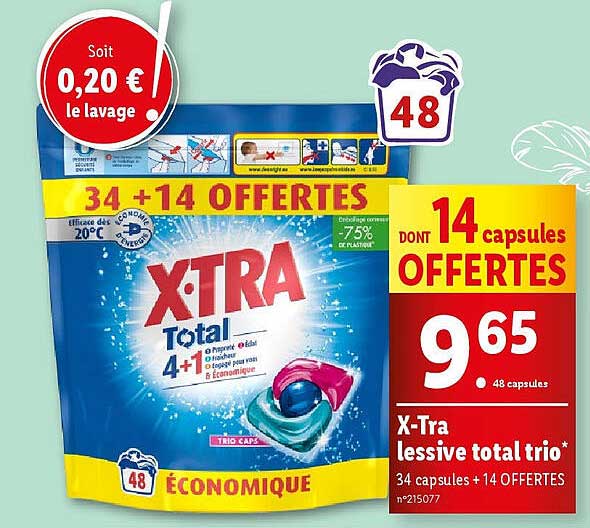Découvrez dès maintenant la offre X-Tra lessive total trio * 34 capsules + 14 OFFERTES dans le catalogue de Lidl. Cette offre est valable du 25/12/2024 au 29/12/2024.
