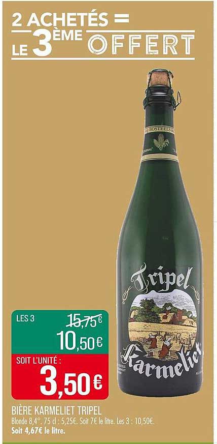 Ne manquez pas cette incroyable promotion sur la bière Karmeliet Tripel. Si vous êtes amateur de bières de qualité, cette offre est faite pour vous. En achetant deux bouteilles, vous recevez la troisième gratuitement, ce qui représente une belle économie sur vos achats.