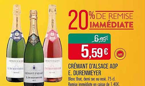 Découvrez une offre exceptionnelle sur le Crémant d'Alsace AOP E. Durenmeyer, un vin pétillant qui séduira vos sens. Avec une remise de 20%, ce crémant devient accessible au prix de 5,59 € au lieu de 6,99 €. Une occasion parfaite pour agrémenter vos apéritifs ou célébrations !