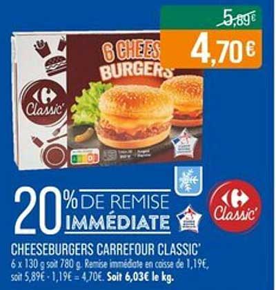 Ne manquez pas l'occasion de faire le plein de saveurs avec les Cheeseburgers Carrefour Classic'. Parfaits pour un repas convivial ou un snack rapide, ces cheeseburgers allient simplicité et gourmandise. Que ce soit pour un dîner en famille ou un goûter entre amis, cette offre est l'idéale pour vos petits moments de partage.