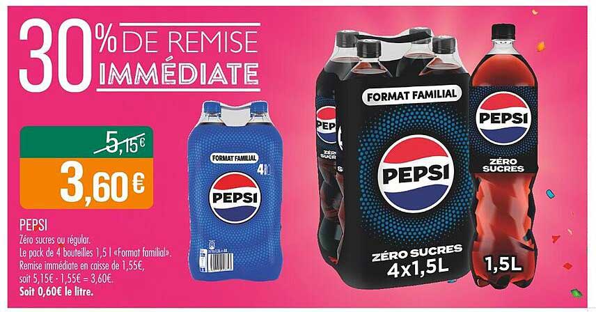 Découvrez une super promotion sur le célèbre soda Pepsi ! Du 28 octobre au 9 novembre, profitez de 30% de remise immédiate sur le pack de 4 bouteilles de 1,5 L. Que vous soyez fan de Pepsi zéro sucres ou de la version régulière, cette offre est faite pour vous.