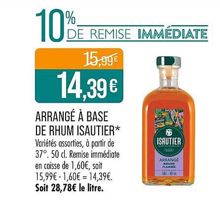 Découvrez l'élégance et le goût authentique de l'arrangé à base de rhum Isautier. Ce produit, élaboré avec soin, est une invitation à savourer des moments de convivialité, tout en profitant d'une remise immédiate. Profitez de cette offre exceptionnelle qui est valable jusqu'au 21 avril 2025, une occasion à ne pas manquer !