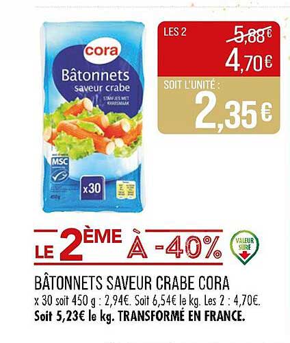 Découvrez l'offre de Bâtonnets Saveur Crabe Cora chez Match! Cette offre fantastique est maintenant disponible dans le nouveau catalogue de Match. Profitez de cette occasion et économisez considérablement sur votre achat.