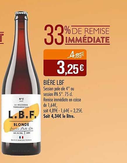 Amateurs de bière, cette offre est faite pour vous ! La Bière LBF se distingue par son goût frais et sa légèreté, parfaite pour les chaudes journées d'été ou pour animer vos soirées entre amis. Avec une réduction de 33 %, c'est le moment idéal pour profiter de cette délicieuse session pale ale ou de la session IPA, spécialement conçue pour satisfaire vos envies de bière.