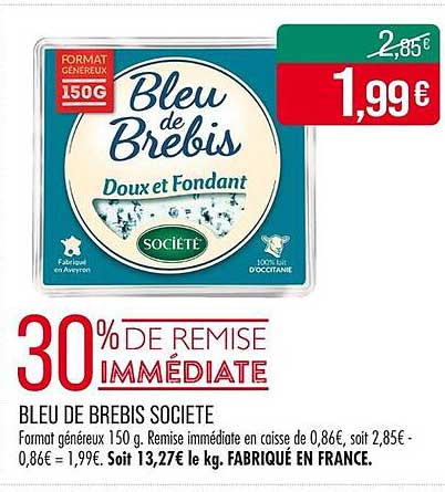Découvrez la superbe offre de Bleu De Brebis Societe dans le nouveau catalogue de Match. En plus de cette offre, vous trouverez de nombreuses autres réductions attrayantes. Vous pouvez facilement commander le Bleu De Brebis Societe en ligne via le site web de Match ou l'acheter dans un magasin près de chez vous.