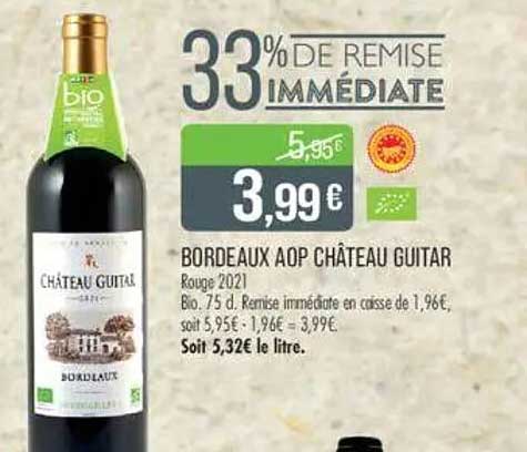 Découvrez le Bordeaux AOP Château Guitar, un vin rouge 2021 qui ravira tous les amateurs de bons crus. Avec une remise immédiate de 33%, c'est le moment parfait pour l'ajouter à votre table. Pour un prix exceptionnel de seulement 3,99 €, vous vous offrez une bouteille bio qui allie qualité et respect de l'environnement.