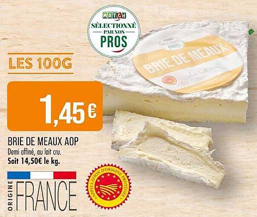 Au prix de 1,45 €, le Brie de Meaux représente une économie notable pour un produit de haute qualité. Habituellement vendu à un prix plus élevé, cette offre spéciale vous permet de découvrir ce fromage emblématique sans vous ruiner. Vérifiez par vous-même la différence de prix et profitez de cette occasion en or pour le goûter.