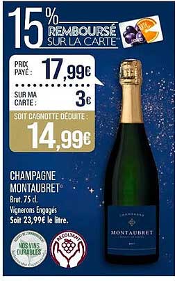 Découvrez la superbe offre de Champagne Montaubret dans le nouveau catalogue de Match. En plus de cette offre, vous trouverez de nombreuses autres réductions attrayantes. Vous pouvez facilement commander le Champagne Montaubret en ligne via le site web de Match ou l'acheter dans un magasin près de chez vous.