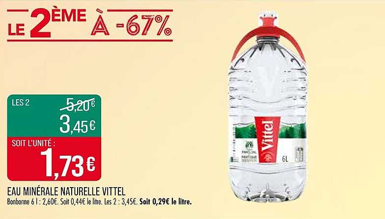 Le prix habituel de cette eau est de 5,20 € pour deux bouteilles, mais grâce à cette promotion, vous ne paierez que 3,45 € pour le deuxième. Une réduction de 67% sur le deuxième article qui vous permettra de faire des économies tout en profitant d'une excellente qualité.