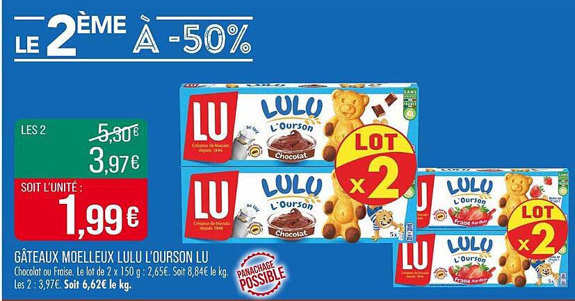 Découvrez une délicieuse promotion sur les Gâteaux Moelleux Lulu l'Ourson LU, un vrai régal pour les petits et les grands. Ces biscuits, alliant la douceur de la fraise et le goût irrésistible du chocolat, permettent de ravir vos pauses goûter en toute simplicité. Profitez de l'offre exceptionnelle du 1er au 13 avril 2025 et faites le plein de gourmandise !