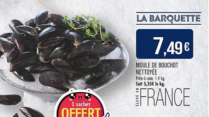 Proposées à seulement 7,49 €, ces moules représentent une excellente affaire par rapport à leur prix habituel de 5,35 € le kg. Avec l'offre actuelle, vous profitez d'une économie tout en vous régalant. De plus, avec un sachet offert, c'est l'occasion idéale de faire plaisir à vos proches.