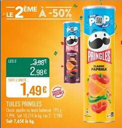 Les Tuiles Pringles sont bien plus qu'une simple collation. Elles se marient à merveille avec vos dips favoris, parfaites pour agrémenter vos soirées. Légères et croustillantes, elles sont idéales pour un snack rapide ou un week-end animé. Sans oublier que le deuxième tube est à moitié prix : pourquoi s’en priver ?