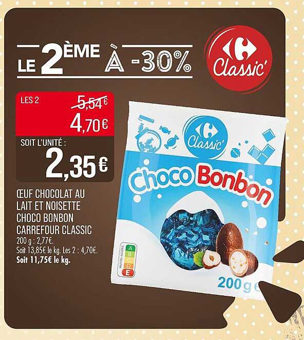 Ne manquez pas cette promotion irrésistible sur les Choco Bonbons Classic ! Jusqu'au 19 octobre, vous profitez de 30% de réduction sur le deuxième paquet. C'est l'occasion parfaite de solidifier vos réserves de douceurs pour vos soirées en famille ou entre amis. Ces petites friandises en chocolat au lait et noisette sont idéales pour accompagner vos moments de convivialité.