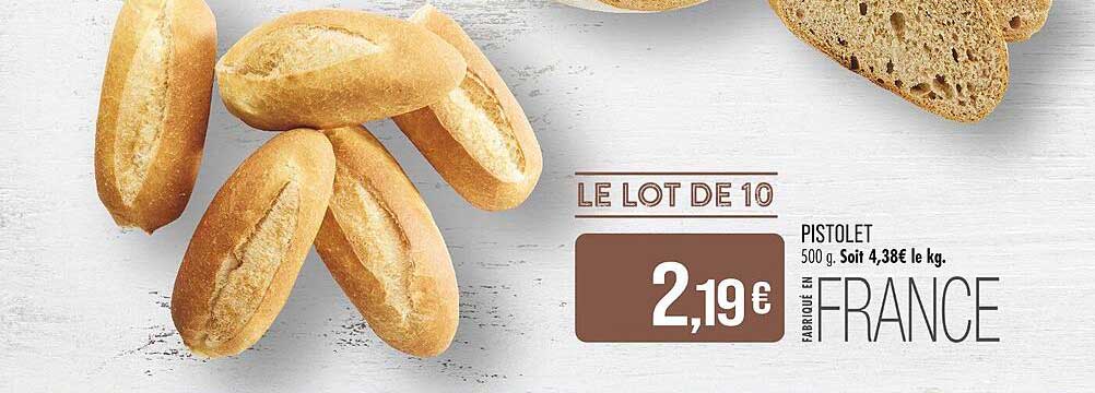 Découvrez notre offre spéciale sur un lot de 10 pistolets, idéal pour vos repas en famille ou entre amis. Avec une texture croustillante à l'extérieur et moelleuse à l'intérieur, ces petits pains sont parfaits pour accompagner toutes vos préparations culinaires. Profitez de cette promotion intéressante qui rend le pain encore plus abordable !