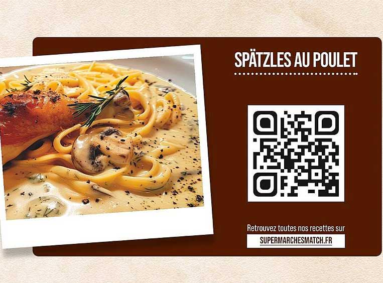 Découvrez dès maintenant la offre SPÄTZLES AU POULET dans le catalogue de Match. Cette offre est valable du 14/10/2025 au 26/10/2025.