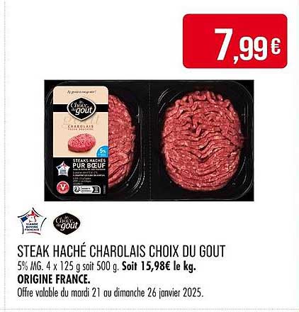 Découvrez la superbe offre de Steak Haché Charolais Choix Du Goût dans le nouveau catalogue de Match. En plus de cette offre, vous trouverez de nombreuses autres réductions attrayantes. Vous pouvez facilement commander le Steak Haché Charolais Choix Du Goût en ligne via le site web de Match ou l'acheter dans un magasin près de chez vous.
