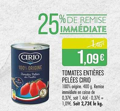 Vous voulez être informé immédiatement dès que le Tomates Entières Pelées Cirio est en promotion? Inscrivez-vous à notre alerte d'offres. Vous recevrez une notification dès que le produit sera disponible à un prix avantageux.