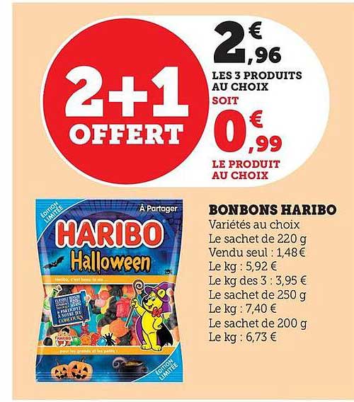 Préparez-vous à célébrer Halloween avec une offre irrésistible sur les bonbons Haribo ! Du 21 octobre au 2 novembre, profitez d'une promotion exclusive : pour l'achat de trois sachets, le troisième est offert. Cela vous permet de savourer les délices sucrés de Haribo tout en réalisant d'importantes économies.