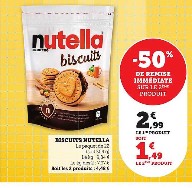 Actuellement, vous pouvez vous offrir le premier paquet de Biscuits Nutella pour seulement 2,99 €. Mais attendez ! Si vous choisissez un second paquet, vous bénéficiez d'une remise immédiate de -50 %, ce qui fait le tarif du second paquet à seulement 1,49 €. En achetant deux paquets, vous ne dépensez que 4,48 €, soit une super affaire pour ravir vos papilles !