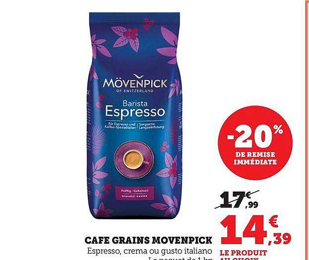 Amateurs de café, réjouissez-vous ! Maximarché vous propose une promotion exceptionnelle sur le café en grains Mövenpick Barista Espresso. Avec une remise immédiate de 20%, c'est l'occasion parfaite de redécouvrir le véritable goût du café fraîchement moulu. Du 11 au 23 novembre 2025, faites le plein de cette délicieuse crème au goût italien pour vos pauses café.