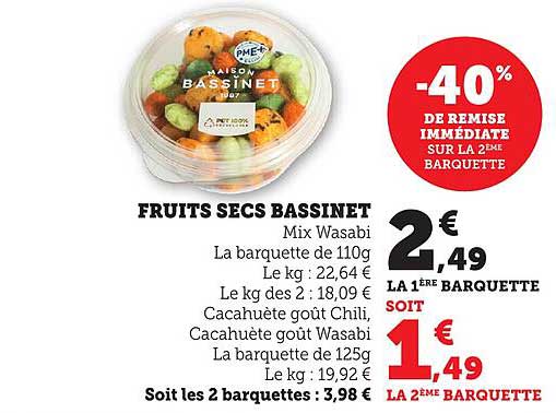 Découvrez une offre irrésistible sur les Fruits Secs Bassinet, un mélange savoureux et intrigant de fruits secs au goût wasabi. Parfait pour agrémenter vos apéritifs ou pour un en-cas original. Profitez d'une remise immédiate sur la deuxième barquette !