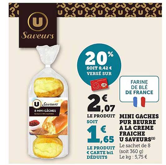 Découvrez une offre alléchante sur les Mini Gaches Pur Beurre à la Crème Fraîche U Saveurs ! Avec un prix de seulement 1,65 € pour le sachet de 8 (soit 360 g), ces délices sucrés sont parfaits pour accompagner vos petits-déjeuners ou vos goûters. Imaginez la texture moelleuse et le goût authentique que ces mini gâteaux apporteront à votre table.