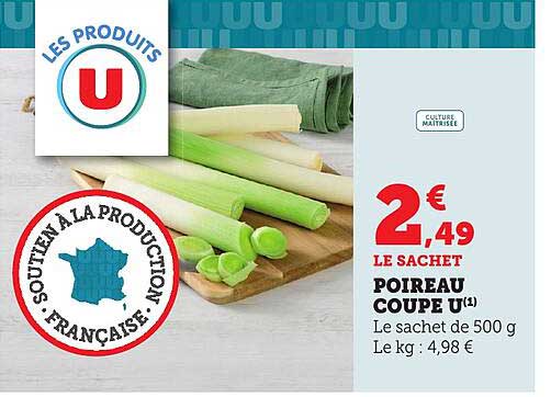 Profitez d'une offre exceptionnelle sur le poireau coupé U, un ingrédient incontournable pour vos plats ! Avec un prix réduit à seulement 2,49 € le sachet de 500 g, c'est le moment idéal d'intégrer ce légume frais dans votre alimentation. Que ce soit pour des soupes réconfortantes ou des plats savoureux, le poireau est un allié de choix en cuisine.