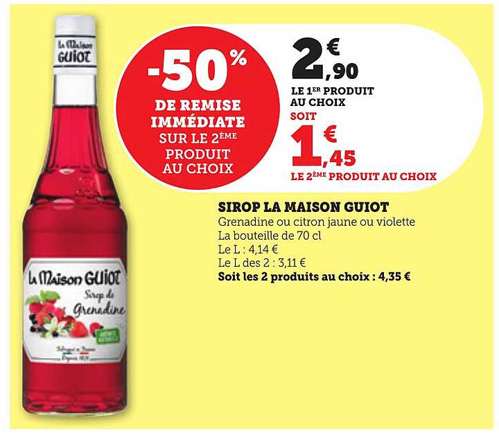 Découvrez le Sirop La Maison Guiot, disponible en grenadine ou citron jaune ou violet, parfaitement adapté pour vos cocktails, desserts et boissons rafraîchissantes. Profitez de cette promotion exceptionnelle sur cette page pour rehausser vos moments de convivialité avec une touche sucrée et fruitée.