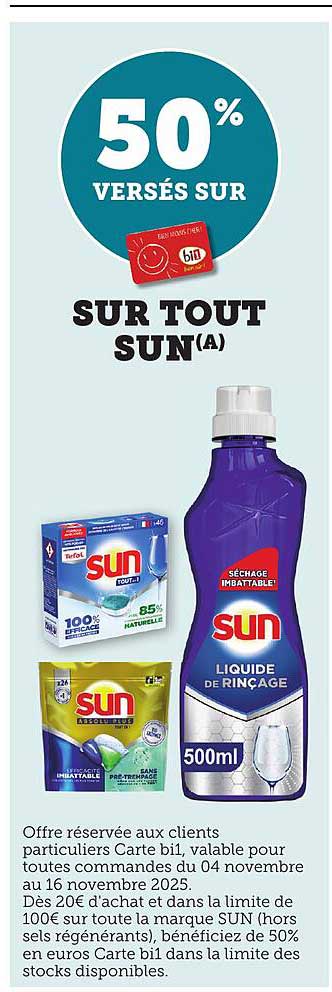 Ne manquez pas cette incroyable promotion sur les produits de la marque SUN ! Du 4 au 16 novembre 2025, profitez d'une remise exceptionnelle de 50% sur une vaste sélection d'articles. Que ce soit pour votre vaisselle quotidienne ou pour toute autre tâche ménagère, SUN a tout ce qu'il vous faut. C'est le moment idéal pour renouveler vos produits tout en réalisant des économies substantielle !