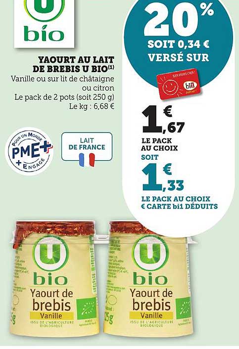 Vous aimez les produits laitiers délicats et savoureux ? Découvrez l'offre exceptionnelle sur le yaourt au lait de brebis U BIO ! Disponible en vanille, châtaigne ou citron, ce pack de 2 pots (250 g) est idéal pour un dessert léger ou un en-cas sain. Profitez de cette offre du 4 au 16 novembre 2025 pour remplir votre frigo avec un produit de qualité, naturel et gourmand.