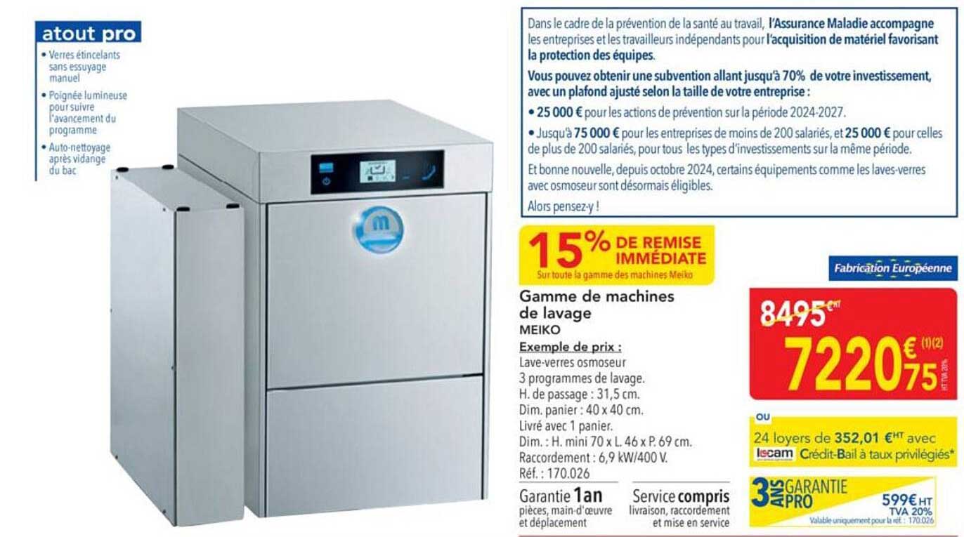 Dans un environnement où la propreté et l'hygiène sont primordiales, la gamme de machines de lavage MEIKO se démarque comme une solution essentielle pour les professionnels. Profitez d'une remise immédiate de 15 % sur ces équipements de haute qualité, idéale pour garantir un service irréprochable dans votre établissement. Cette promotion est valide du 17 juillet au 13 août 2025. N'attendez plus pour bénéficier de cette offre avantageuse !