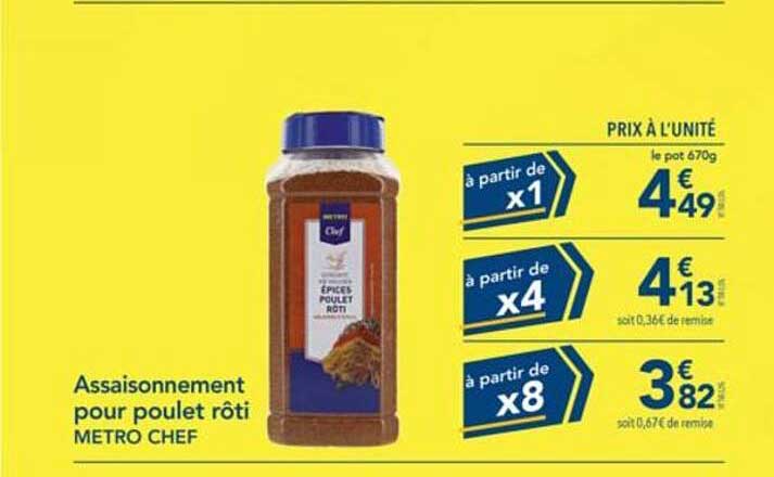 Le plaisir d'un bon poulet rôti commence par un assaisonnement de qualité. Avec l'assaisonnement pour poulet rôti de METRO CHEF, vous apporterez à vos plats une saveur riche et délicieuse qui ravira vos convives. Cette offre exceptionnelle, valable du 27 mars au 23 avril 2025, vous permet de découvrir ce produit à un prix imbattable.