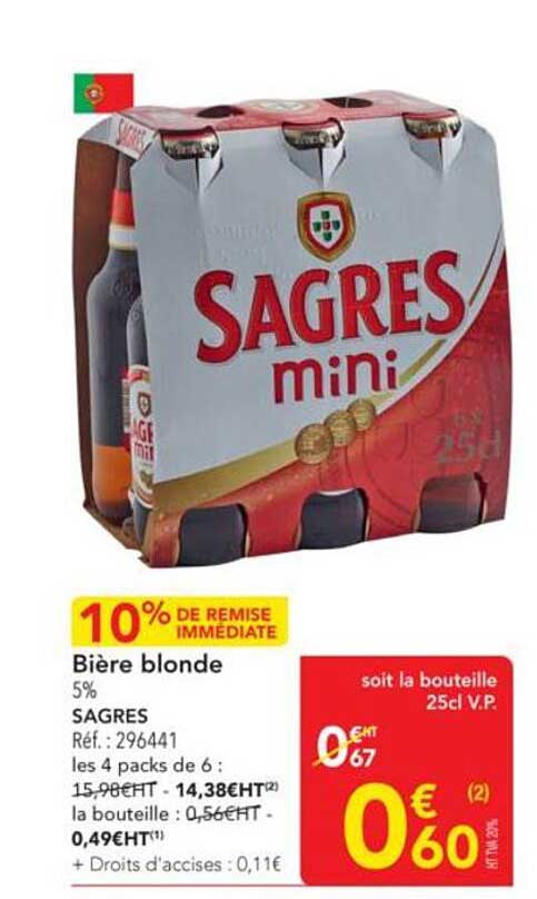 Découvrez la délicieuse bière blonde SAGRES mini, parfaite pour vos moments de convivialité. La promotion actuelle, valable jusqu'au 29 octobre 2025, vous permet de savourer cette bière de qualité à un prix réduit. Avec un taux d'alcool de 5%, elle est idéale pour l'apéritif ou les soirées entre amis.