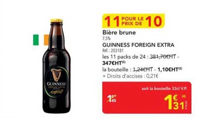 Découvrez la Guinness Foreign Extra, une bière brune emblématique au goût riche et complexe, parfaite pour accompagner vos moments de convivialité. Actuellement, METRO vous propose une offre exceptionnelle : 11 pour le prix de 10. C'est l'occasion rêvée de savourer cette excellente bière tout en réalisant des économies substantielles !