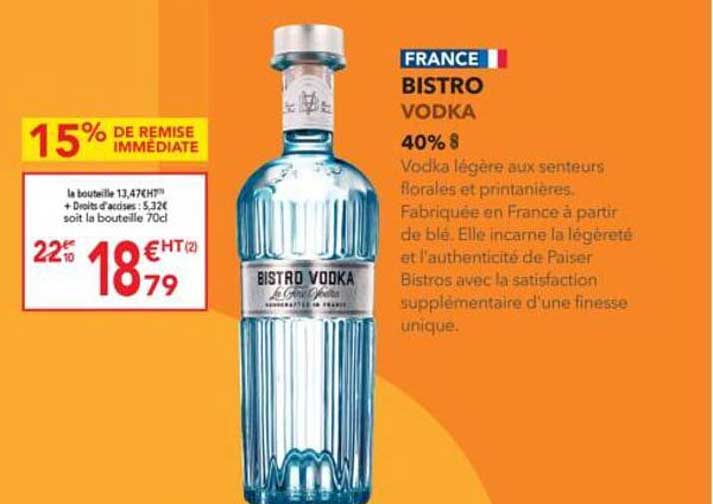 Découvrez la BISTRO VODKA, une vodka délicate qui vous envoûtera par ses senteurs florales et printanières. Fabriquée en France à partir de blé, elle incarne l'authenticité et la légèreté des Bistros, tout en offrant une expérience gustative unique qui ravira même les palais les plus exigeants. C'est l'occasion parfaite de savourer une bonne vodka à un prix imbattable, valable jusqu'au 25 octobre 2025 !