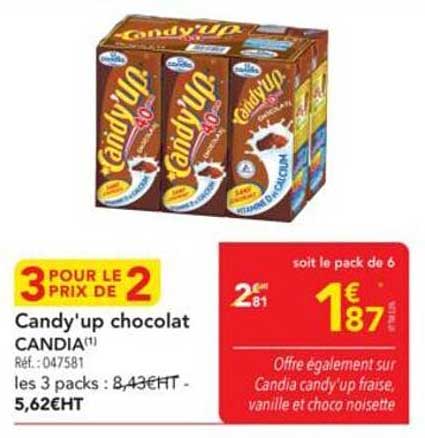 Découvrez l'irrésistible offre sur le Candy'up chocolat de CANDIA, une délicieuse boisson qui ravira petits et grands. Disponible du 2 au 15 octobre 2025, cette promotion est l'occasion rêvée de faire le plein de plaisir à prix réduit.