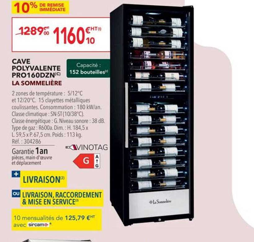 Initialement proposé à 1289€, le prix actuel de 1160€ représente une remise immédiate de 10%. Une belle occasion de faire des économies tout en investissant dans un produit de qualité supérieure. Grâce à cette offre, vous bénéficiez d'une cave à vin moderne à un prix compétitif.