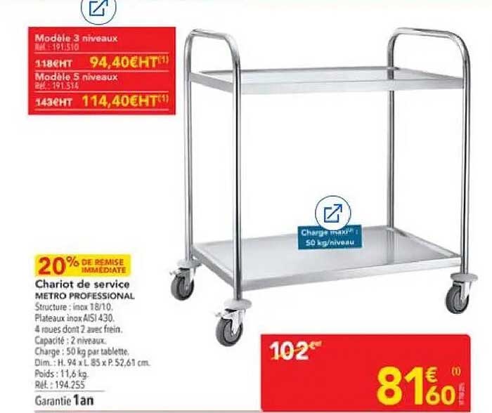 Le prix actuel de cette offre est de 81,60€ au lieu de 102€, ce qui vous permet d'économiser 20,40€. Cette réduction substantielle en fait une excellente affaire pour les professionnels de la restauration ou pour toute personne ayant besoin d’un chariot robuste et fiable.