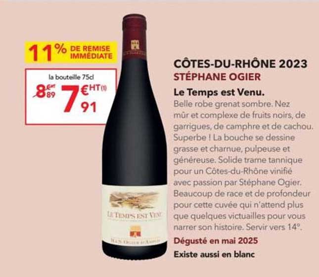 Si vous êtes amateur de vin, cette promotion est à ne pas manquer ! Le Côtes-du-Rhône 2023, surnommé "Le Temps est Venu", est un véritable bijou de la région. Disponible à un prix exceptionnel, ce vin promet d'enchanter vos soirées et vos repas. Profitez d'une remise immédiate de 11 % pour acquérir cette bouteille au caractère unique.