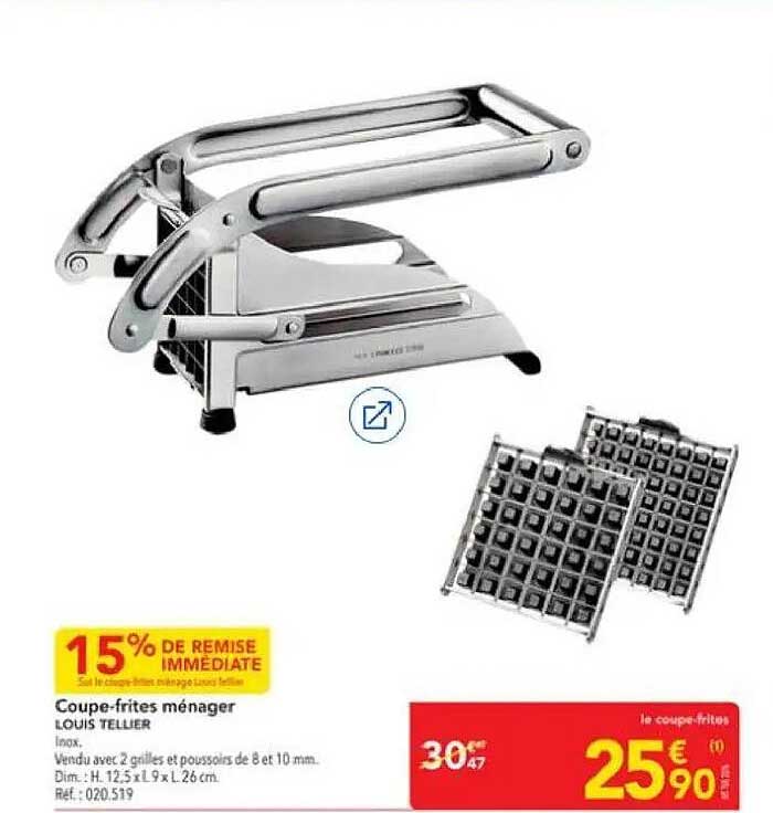 Le coupe-frites ménager de Louis Tellier est l'outil indispensable pour tous les amateurs de frites maison ! Avec sa conception en inox, il allie robustesse et élégance, rendant la préparation de vos frites plus rapide et efficace. Profitez d'une offre exceptionnelle avec 15 % de remise immédiate, valable jusqu'au 29 novembre 2025.