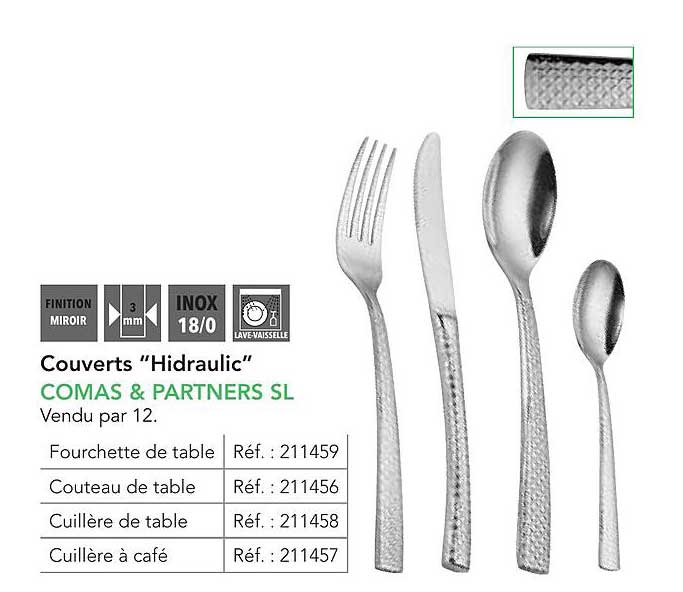 Découvrez notre offre exceptionnelle sur les couverts "Hidraulic" de la marque COMAS & PARTNERS SL. Parfaits pour toutes vos occasions, ces couverts sont vendus par 12 et ajoutent une touche d'élégance à votre table. Profitez de cette promotion valable jusqu'à la fin de l'année 2026 !