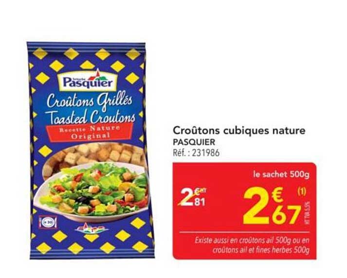 Ne manquez pas cette opportunité unique de découvrir les Croutons cubiques nature de Pasquier, parfaits pour rehausser le goût de vos plats. Que ce soit pour une salade, une soupe ou un plat chaud, ces croutons apporteront une texture croustillante et des saveurs irrésistibles à vos préparations. Profitez de cette offre du 30 octobre au 26 novembre 2025 pour faire le plein de gourmandise !