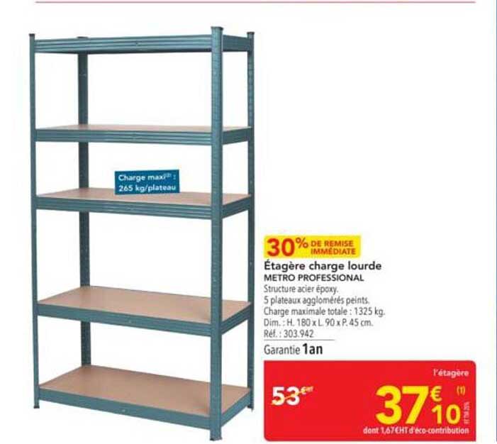 Découvrez notre étagère charge lourde METRO PROFESSIONAL, spécialement conçue pour répondre à vos besoins de rangement. Avec une remise de 30 %, c'est le moment idéal pour faire le plein d'équipements de qualité pour votre espace de travail ou de stockage.