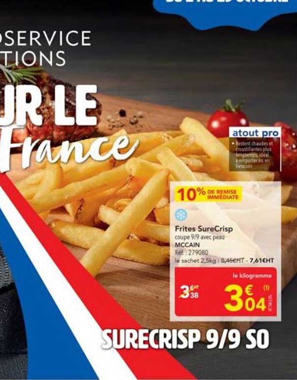 Actuellement, le prix des Frites SureCrisp est de 3,04 € le kg, avec une remise immédiate de 10%. L'ancien prix était de 3,38 € le kg, ce qui représente une économie appréciable pour vos achats. Ne manquez pas cette occasion de faire des économies tout en proposant un produit de qualité supérieure.