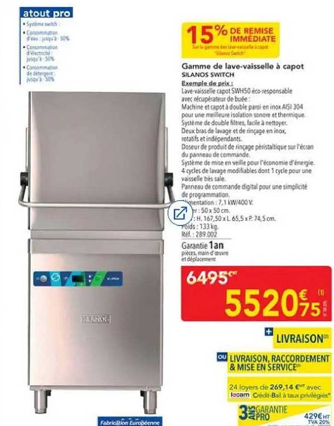 Initialement proposé à 6495€, ce lave-vaisselle est maintenant à seulement 5520,75€, soit une remise de 15%. Cette réduction significative rend l'offre particulièrement attractive pour les professionnels soucieux de leur budget.