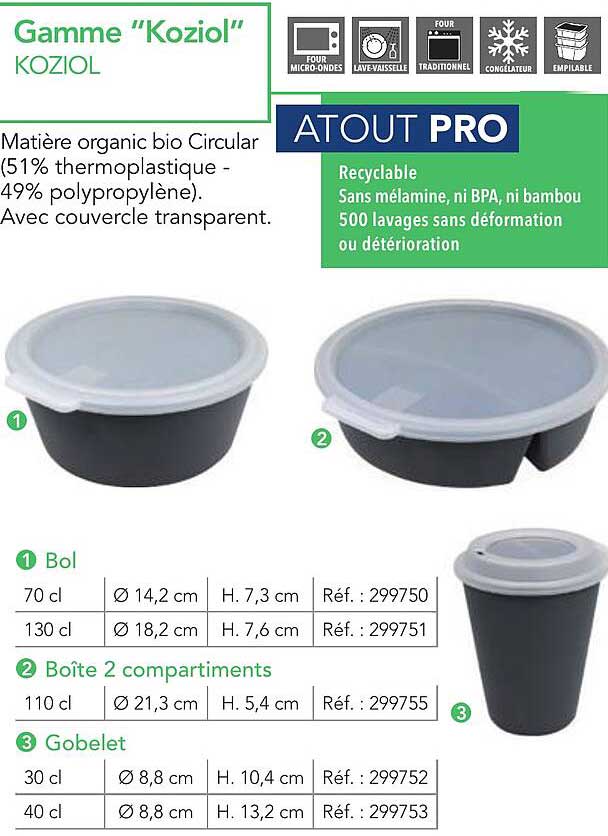 Découvrez la gamme 'Koziol', une collection d'ustensiles pratiques et durables, parfaite pour répondre à tous vos besoins de cuisine. Grâce à sa conception innovante en matière organic bio Circular, ces produits allient respect de l'environnement et fonctionnalité. À utiliser aussi bien au four qu'au micro-ondes, ces contenants sont idéaux pour réchauffer vos plats préférés en toute simplicité.